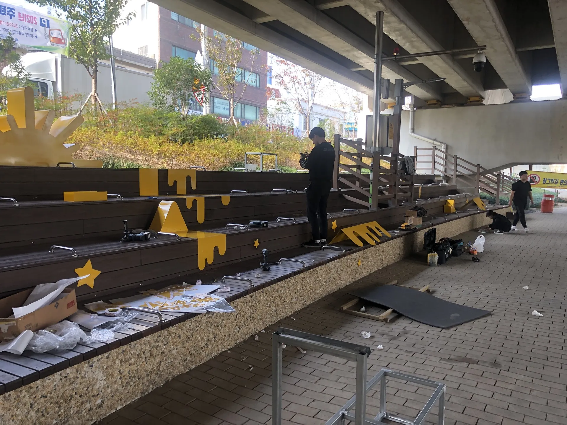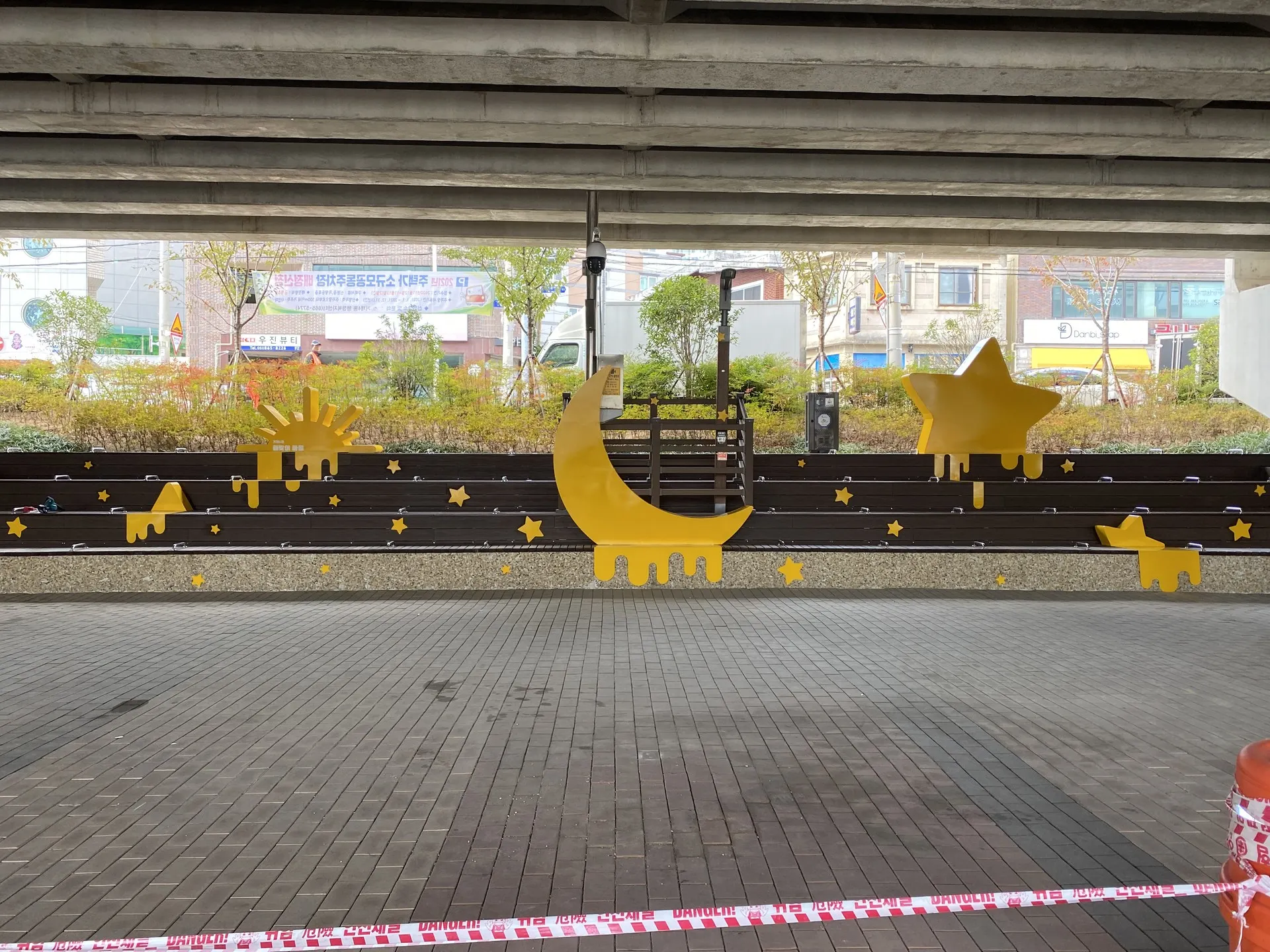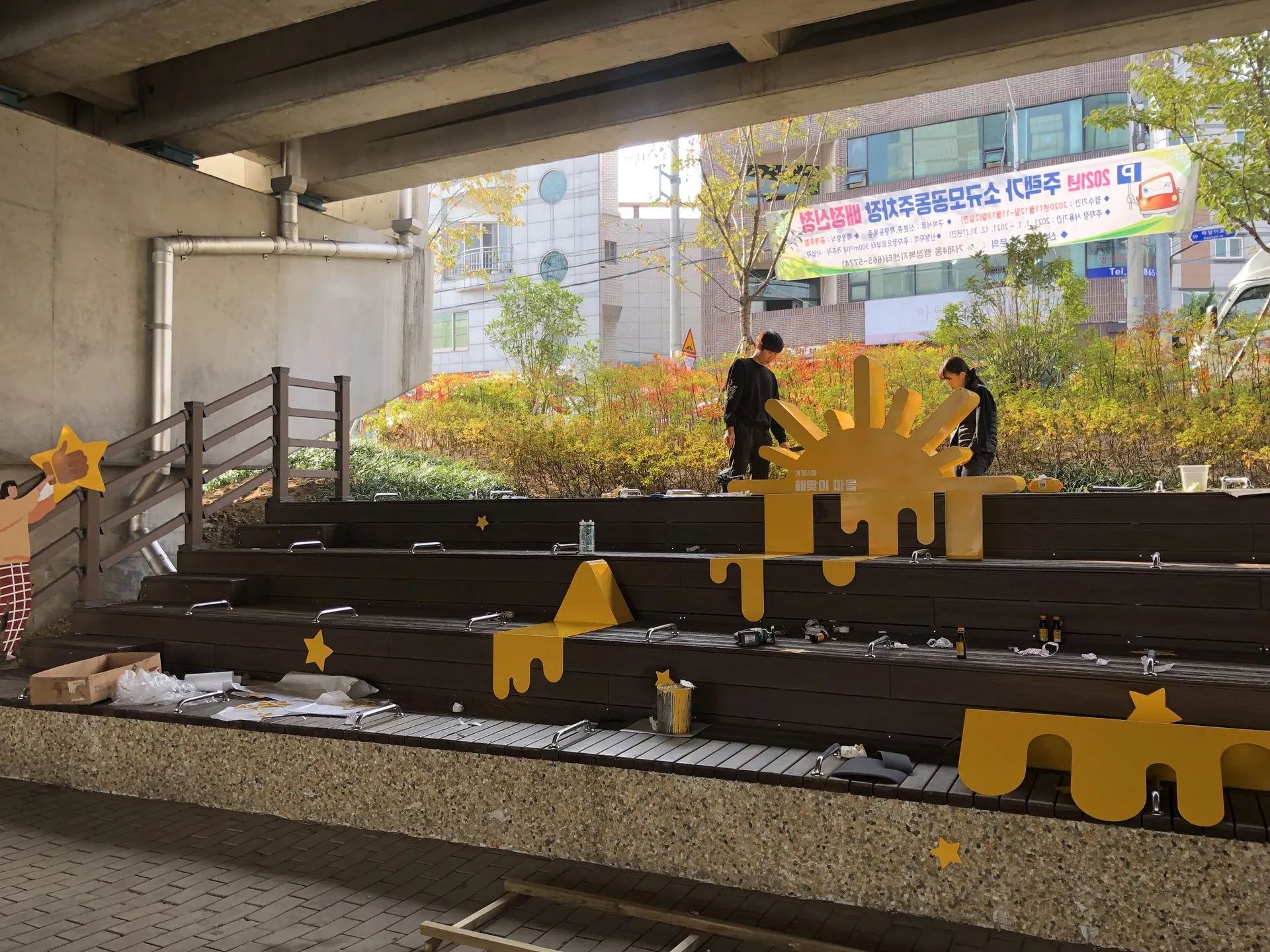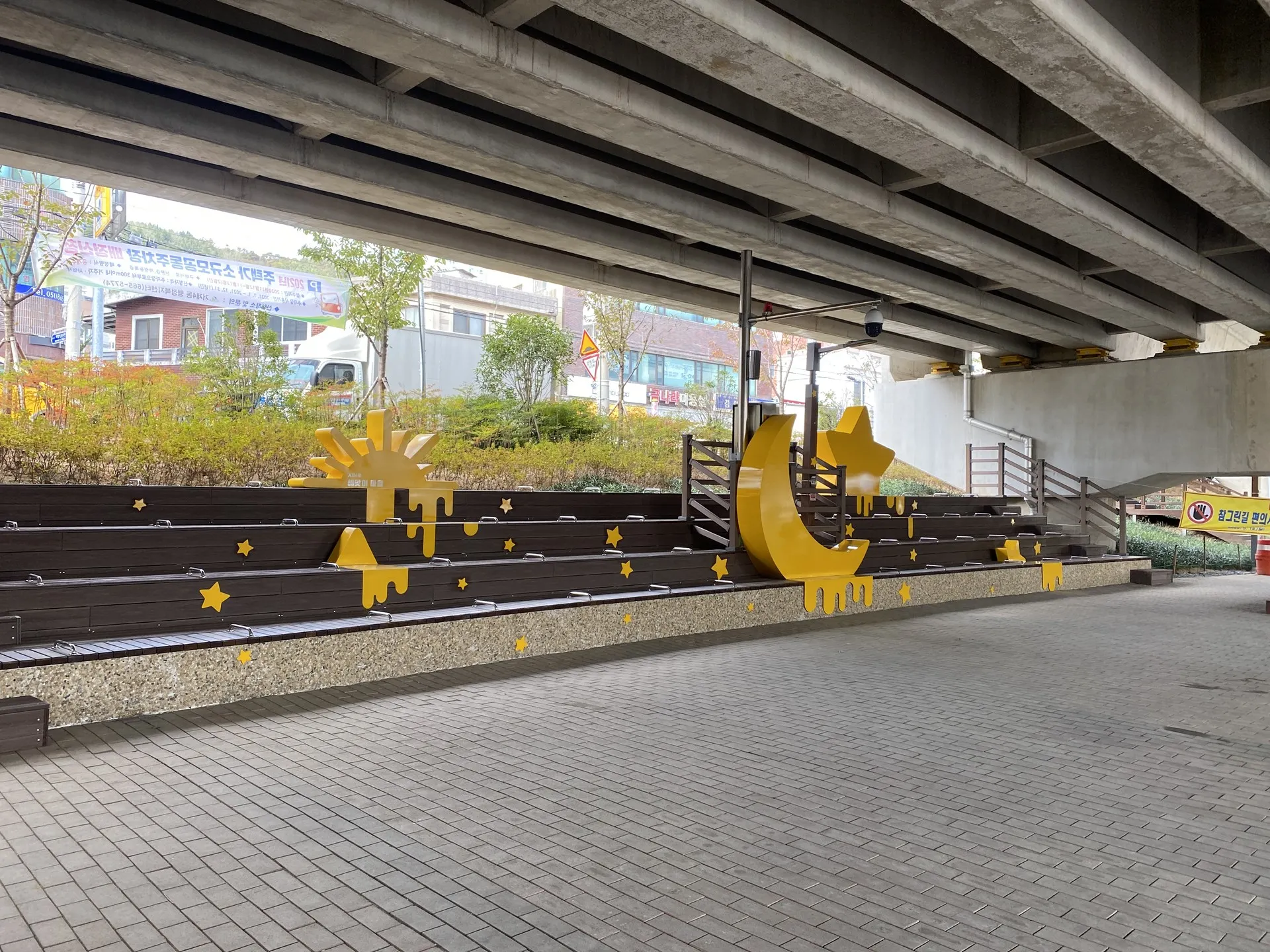 공간 특성상 사람들이 많이 모이는 행사가 주기적으로 열리며 인파에 의해 벽화가 가려질 가능성을 고려해 벽화보다는 조형물을 제안. 이후 고가 다리 아래 있던 쉼터 시설물을 활용하여 조형물 설치.