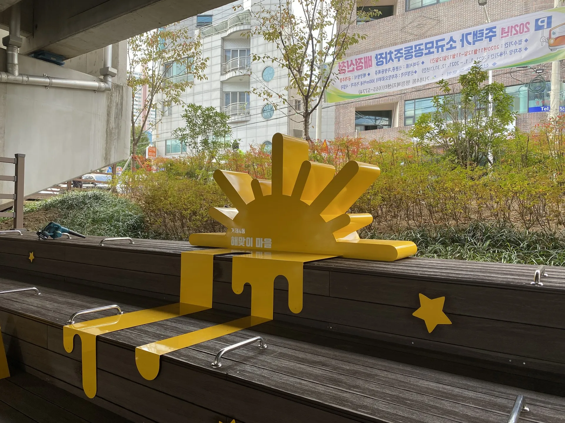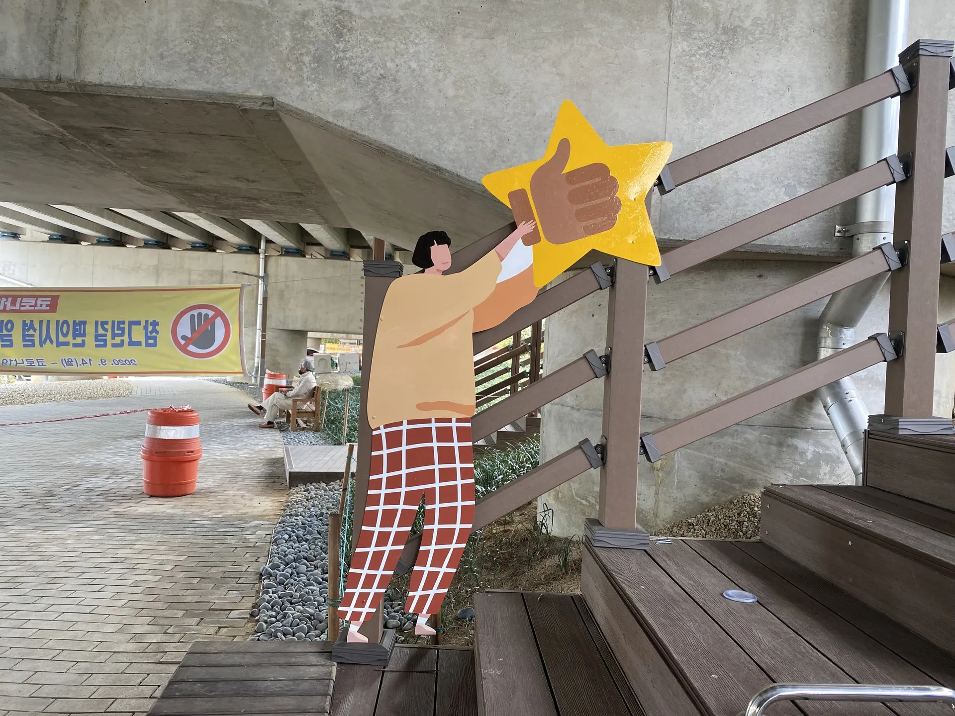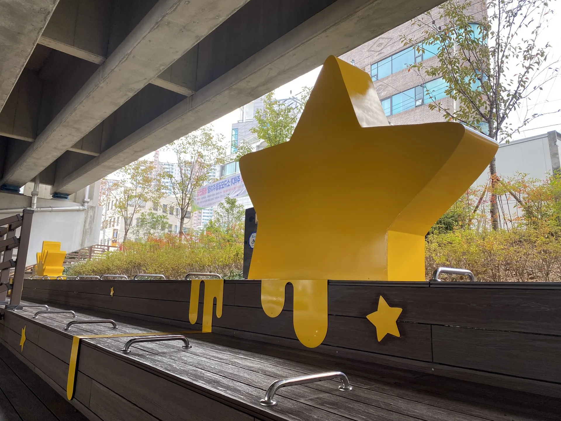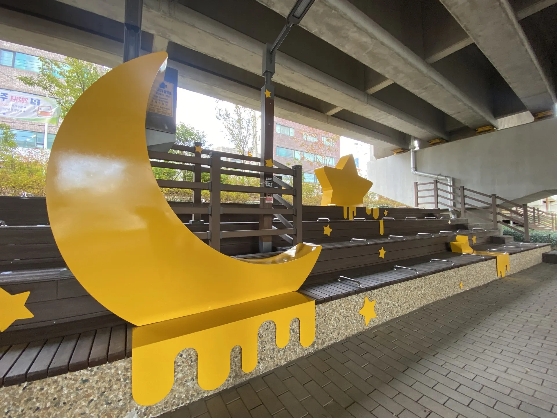 공간 특성상 사람들이 많이 모이는 행사가 주기적으로 열리며 인파에 의해 벽화가 가려질 가능성을 고려해 벽화보다는 조형물을 제안. 이후 고가 다리 아래 있던 쉼터 시설물을 활용하여 조형물 설치.
