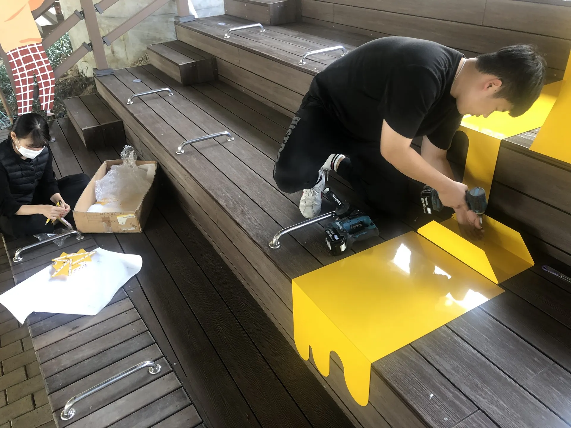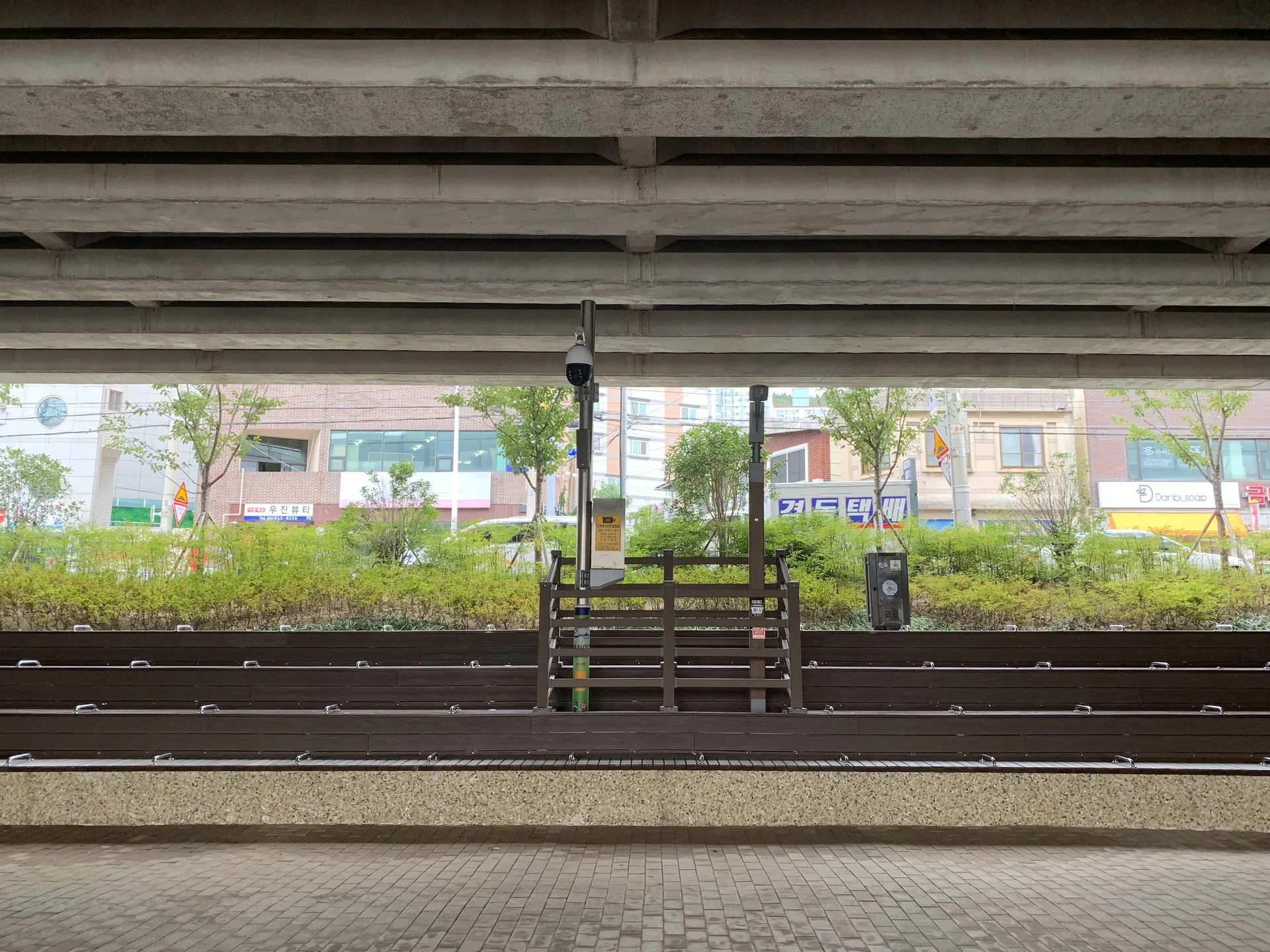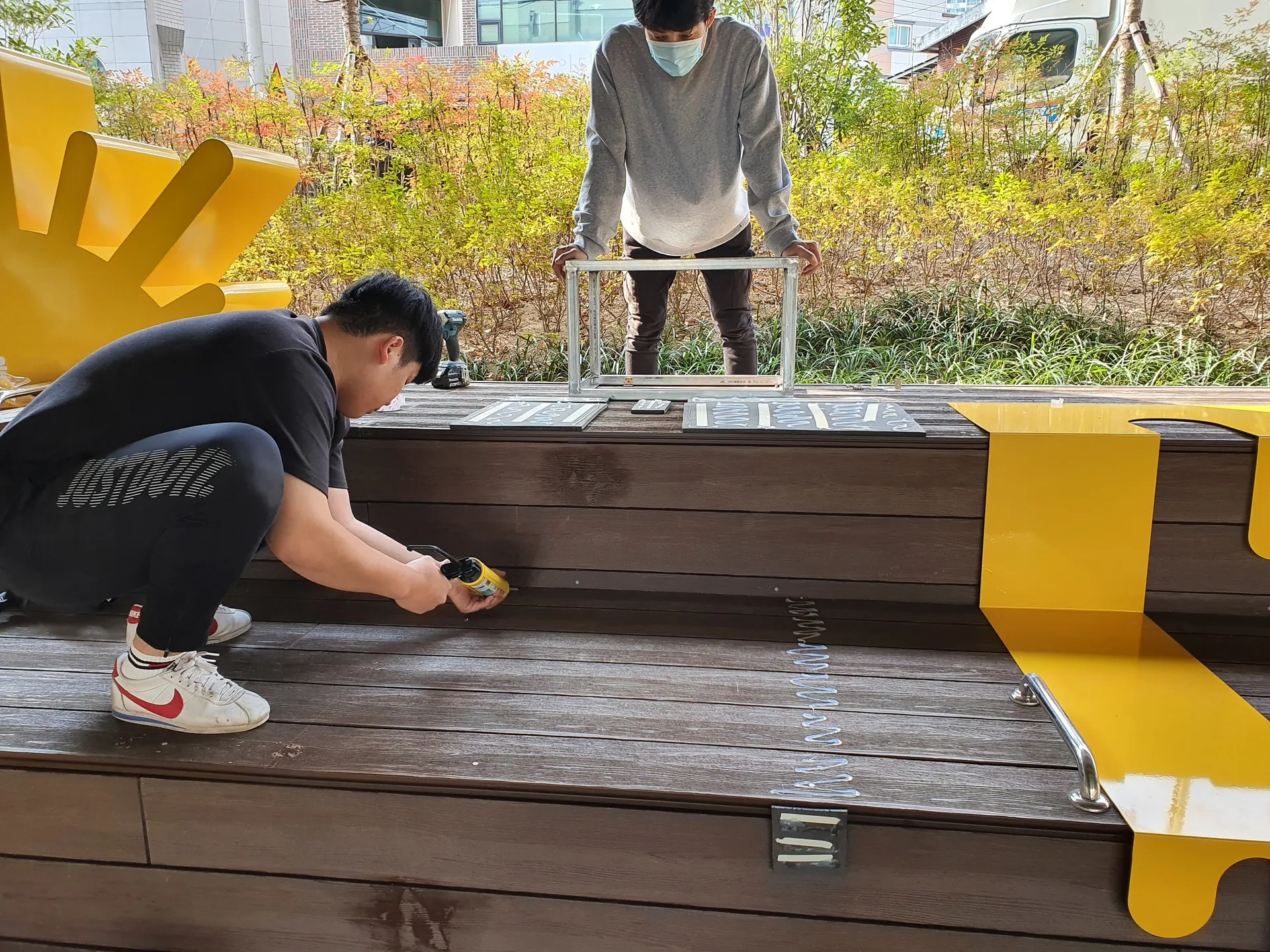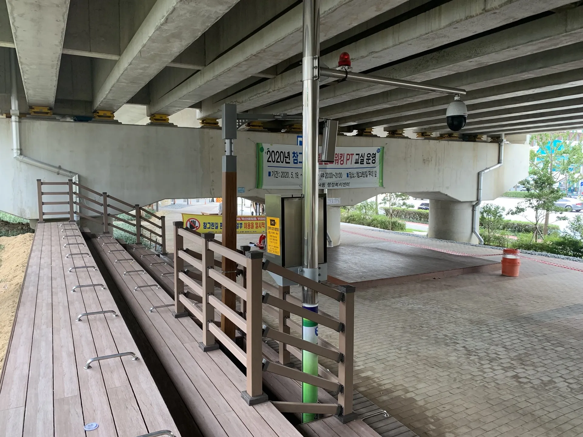 공간 특성상 사람들이 많이 모이는 행사가 주기적으로 열리며 인파에 의해 벽화가 가려질 가능성을 고려해 벽화보다는 조형물을 제안. 이후 고가 다리 아래 있던 쉼터 시설물을 활용하여 조형물 설치.