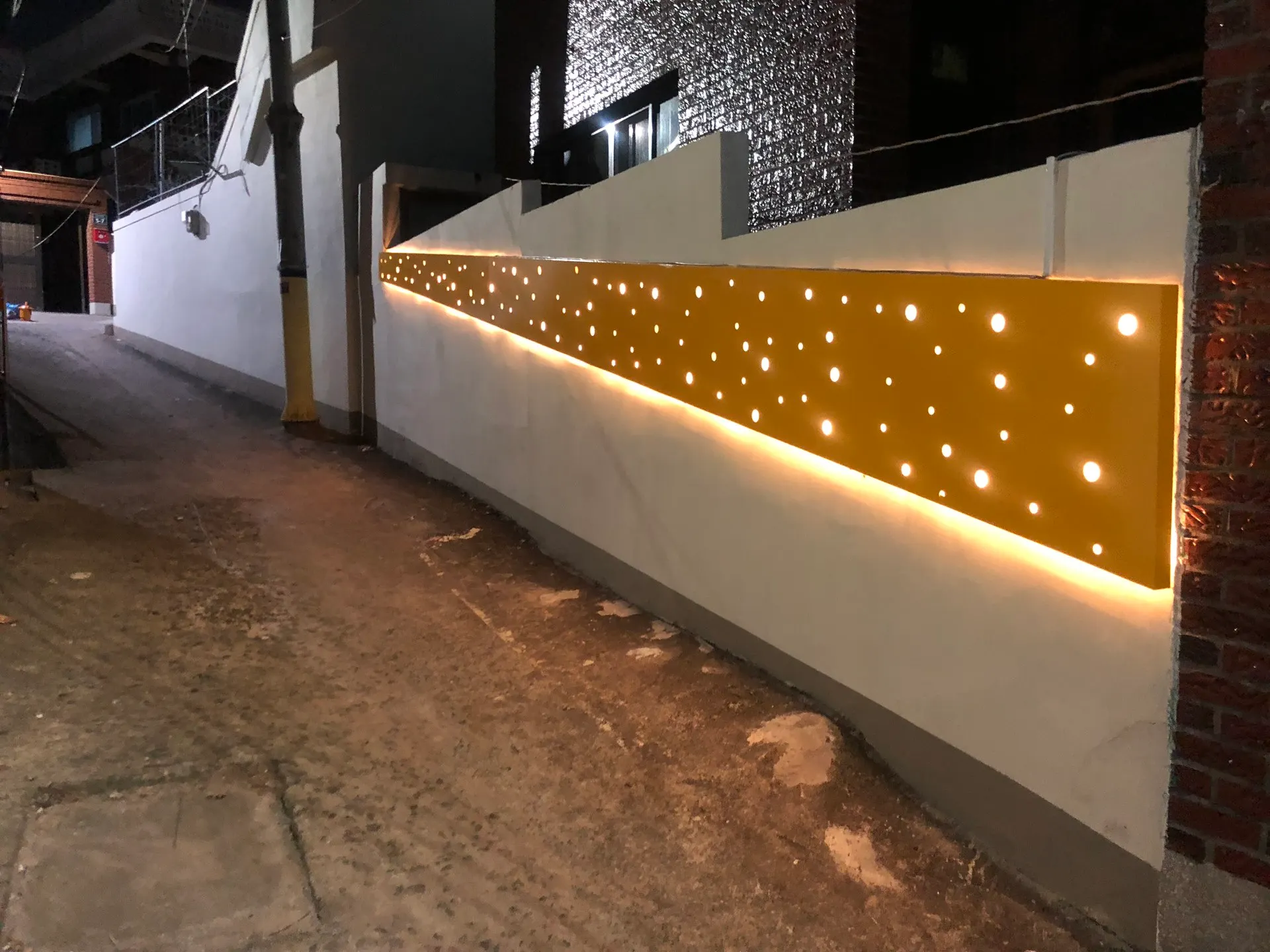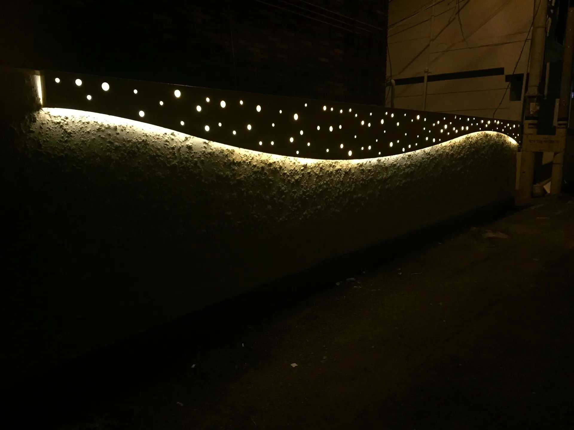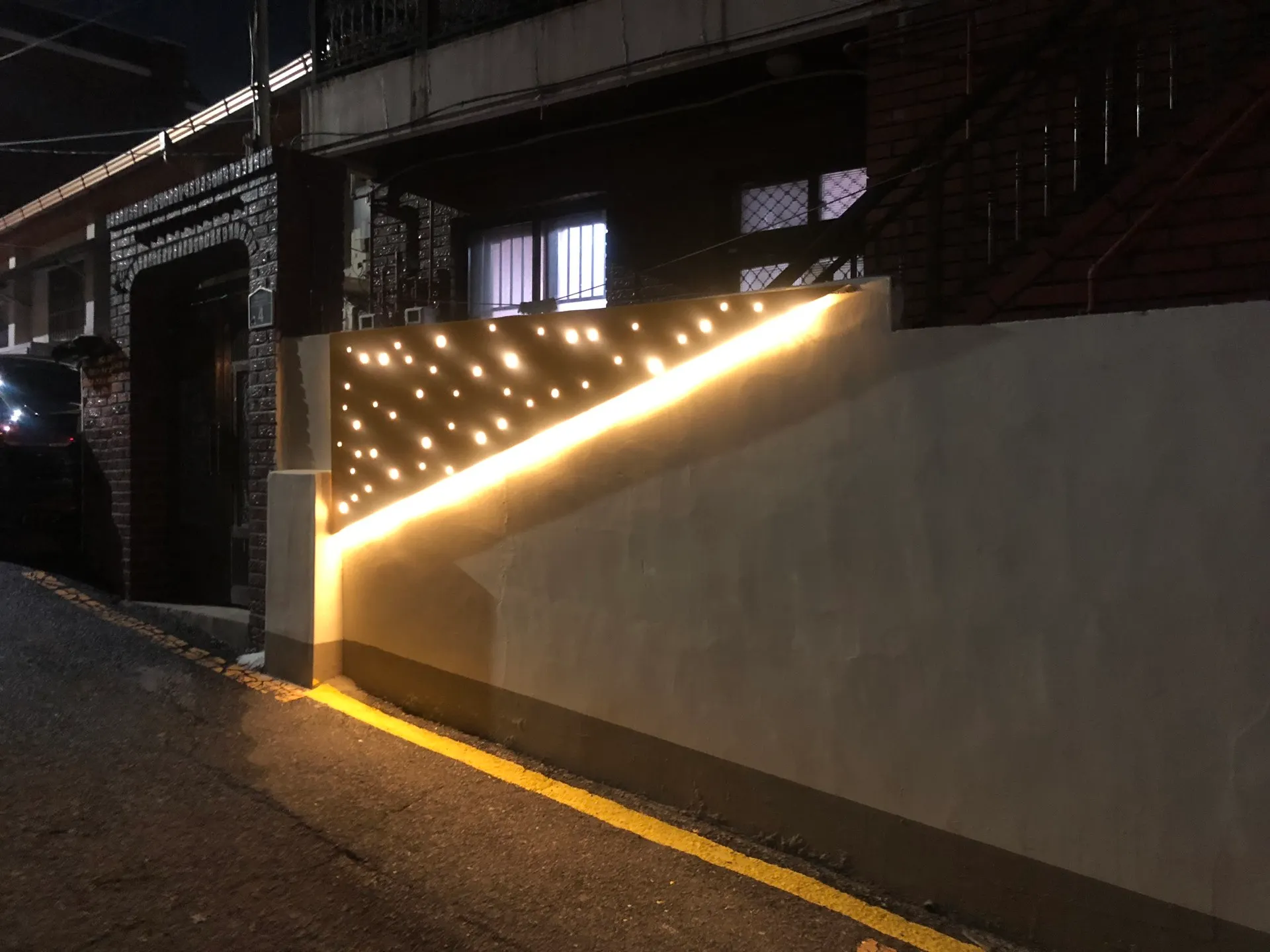 마을 주민들과 몇 개월간의 협의를 거쳐 기존 벽에 도장작업을 진행, 이후 함께 ‘별빛이 빛나는 마을’ 빛 조형물을 설치.