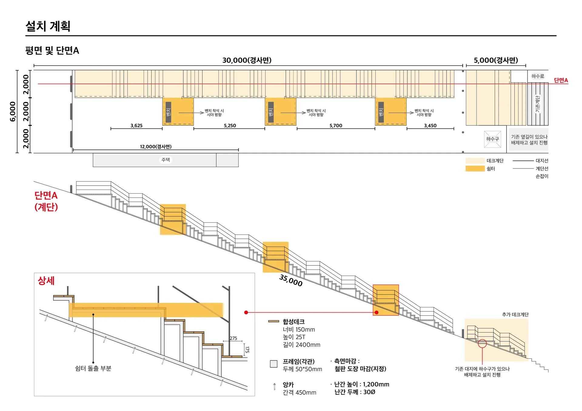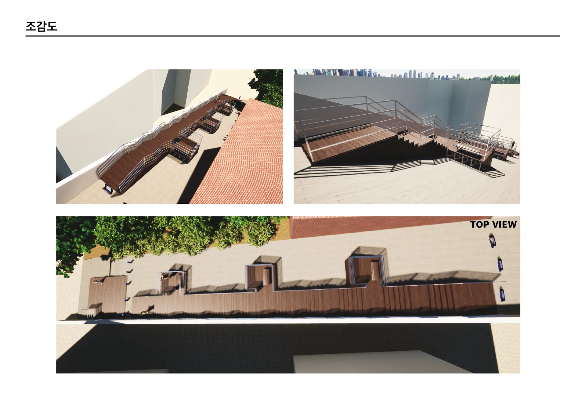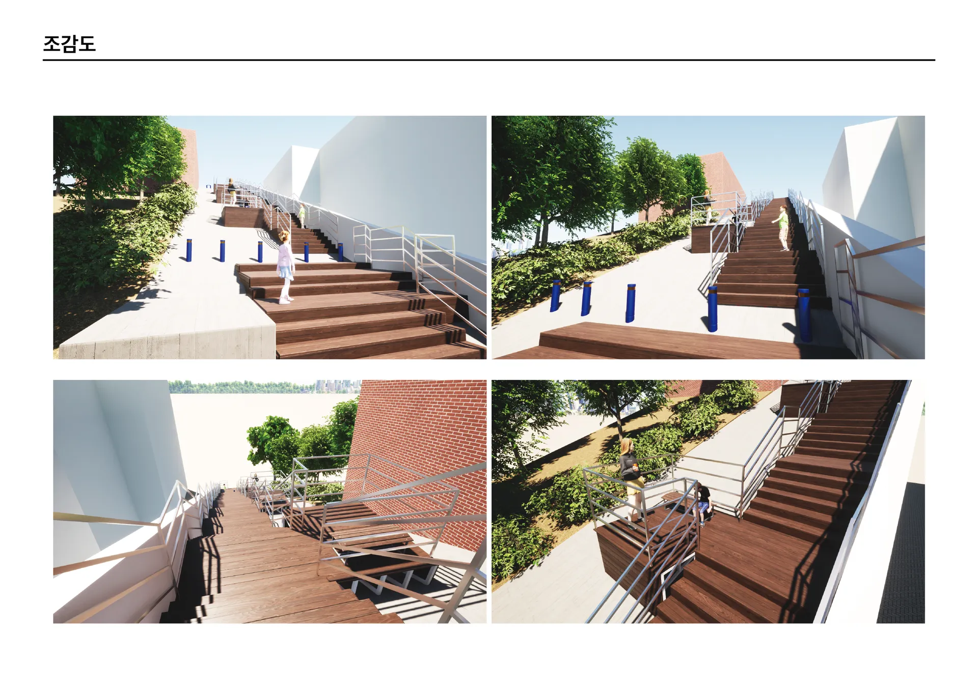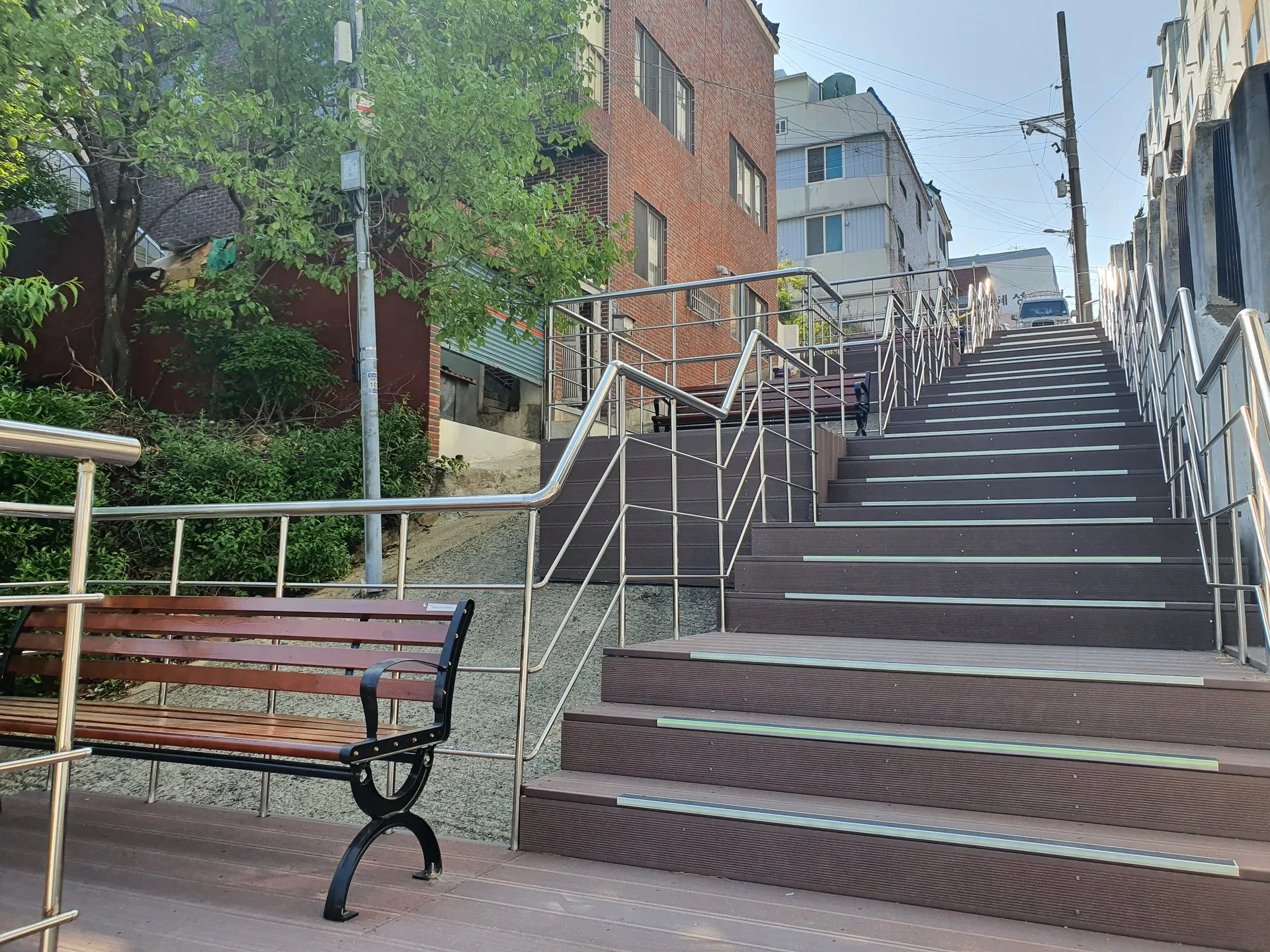 계단을 오르다 중간에 쉴 수 있는 3개의 벤치 쉼터 조성.